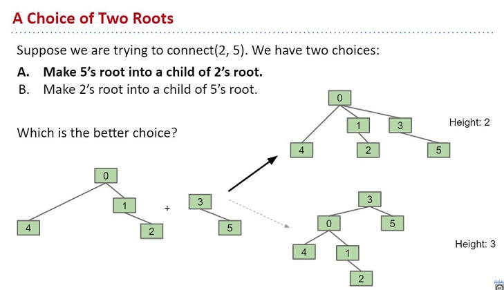 You might wondering why not use the height of the tree? The reason is worst case performance for HeightedQuickUnionDS is asymptotically the same! Both are Θ(log(N)). And resulting code is more complicated with no performance gain.